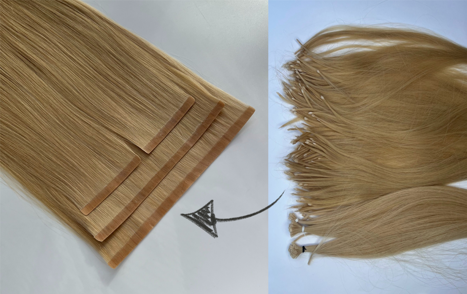 Przerabiamy kapsułki, taśmy, tresy oraz włosy w kitkach na bio taśmy. To najprostszy sposób, żeby spróbować metody bez dużych kosztów. Zamiast wyrzucać stare włosy – zamieniasz je w nowy, wygodniejszy i bardziej komfortowy system.