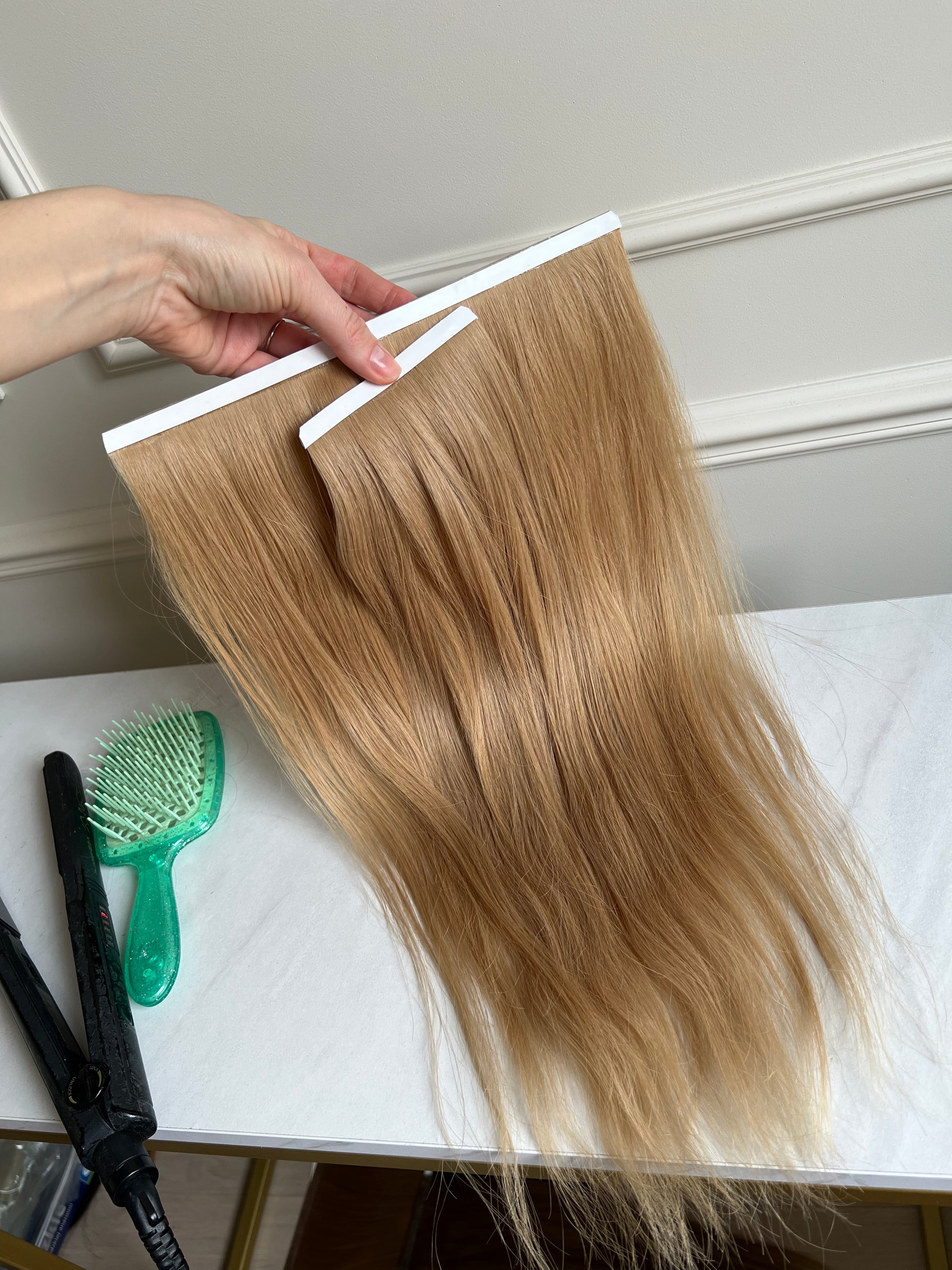 Zestaw włosów ciemny blond na BIOtaśmie wielokrotnego użytku - elastyczne BIOTAŚMY wykonane z 100% naturalnych słowiańskich włosów najwyższej jakości w kolorze ciemny blond. Możesz łatwo założyć je samodzielnie w domu w zaledwie 20 minut lub skorzystać z usług najbliższego salonu fryzjerskiego. Nie musisz ich zdejmować przez maksymalnie 1,5 miesiąca.